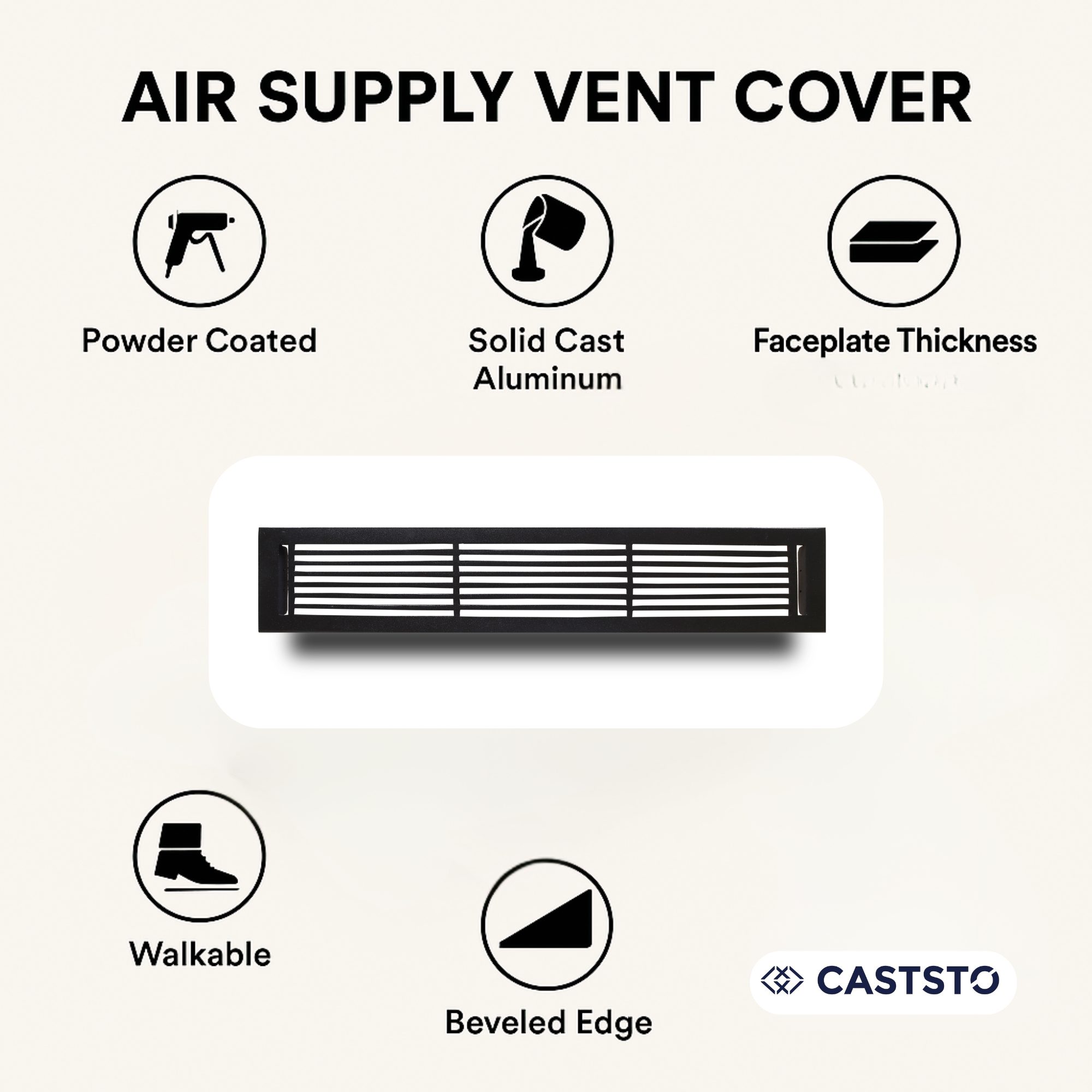 - Size: Caststo Express 3×24 Cast aluminum floor air return grille is designed to fit a duct size of 3″x24″ and has an overall faceplate size of 5″x26″. It’s a decorative cover for air vents on walls and ceilings, ensuring good airflow.