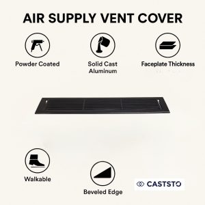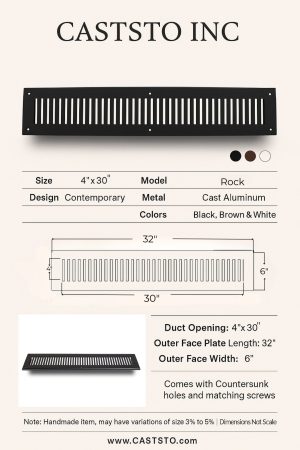 Easy Installation: Comes with matching screws for easy installation on walls or ceilings. Hassle-free installation process for upgrading your HVAC system. For floor vent installation, simply remove the old vent and slip in the new Caststo Rock cast aluminum floor vent grille 4×30.